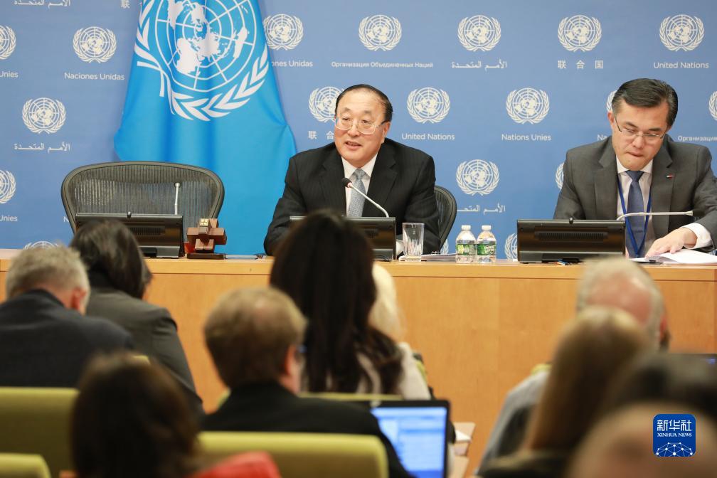 11月1日,在位于紐約的聯合國總部,中國常駐聯合國代表張軍(左)在媒體吹風會上講話。
