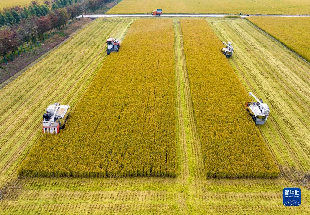 11月4日,農民駕駛農機在江蘇省泰州市姜堰區顧高鎮翟莊村田間收割水稻(無人機照片)。