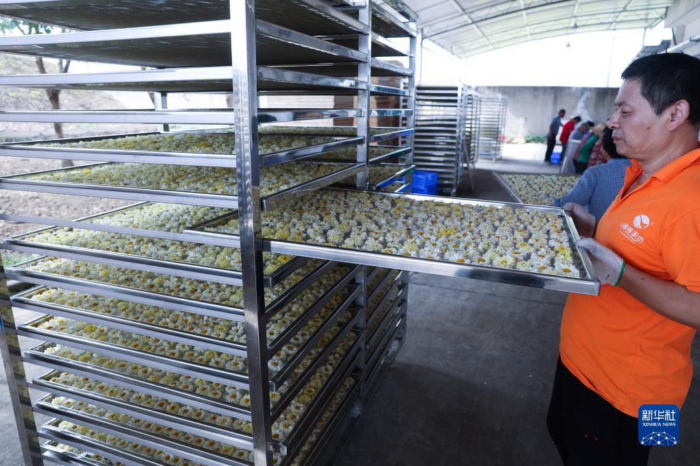 11月4日,在三村村一家現(xiàn)代農(nóng)業(yè)企業(yè)內(nèi),工作人員把分揀好的杭白菊送入車間進(jìn)行進(jìn)一步加工。