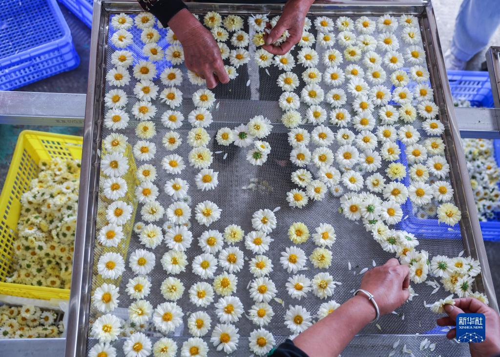 11月4日,在三村村一家現代農業企業內,村民分揀剛剛采摘的杭白菊。