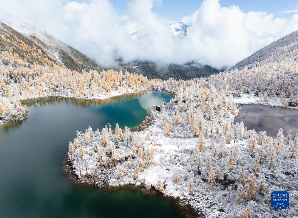 雪山、藍天白云和黨嶺村葫蘆海、彩林構成一幅優美的畫卷(10月27日攝,無人機照片)。