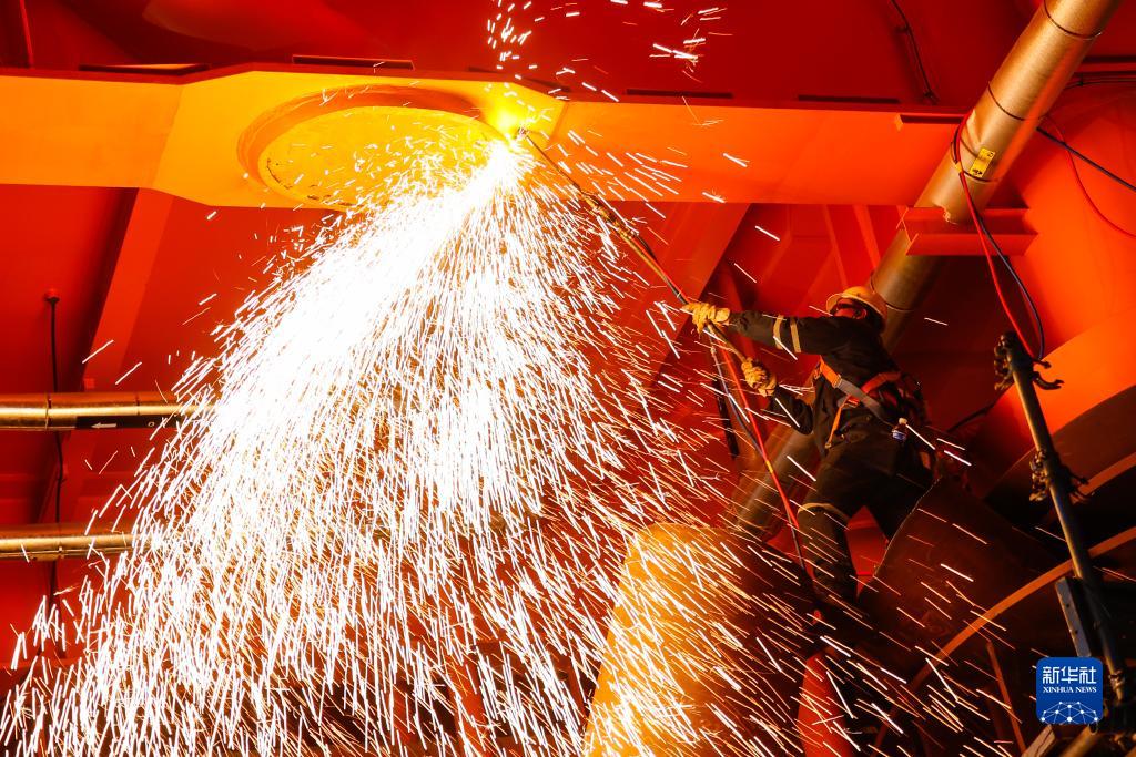 11月4日,工人在埕北油田中心平臺作業現場進行切割作業。
