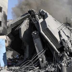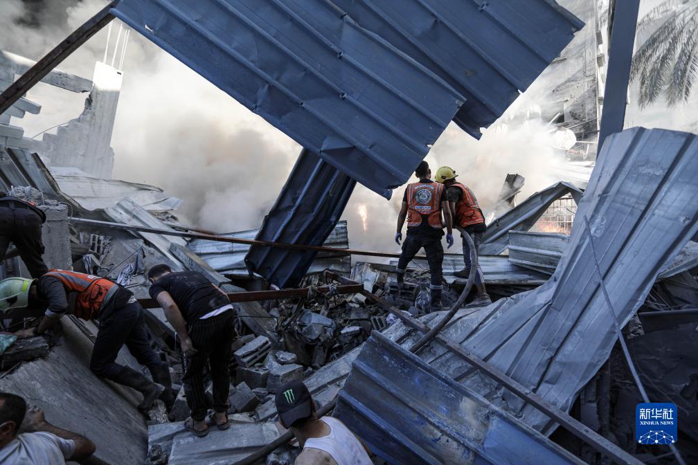 11月4日,在加沙城,救援人員在遭以色列襲擊后的建筑廢墟中實施救援。