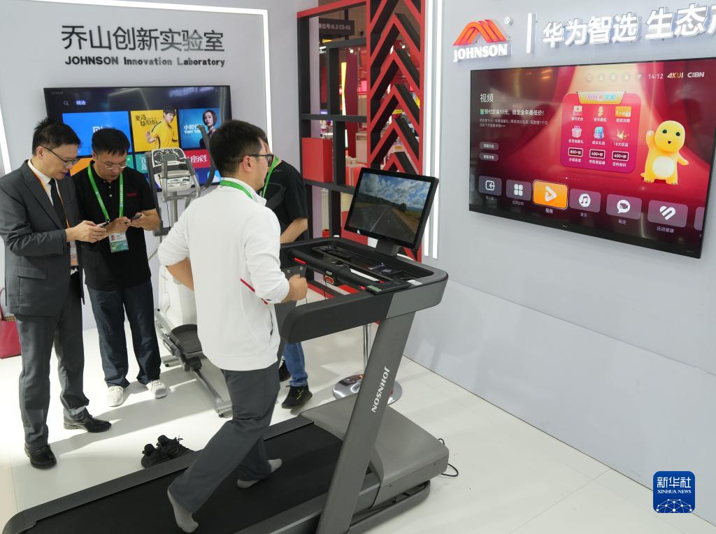 11月5日在第六屆進博會消費品展區喬山展臺拍攝的喬山華為智選合作款高端智能跑步機。