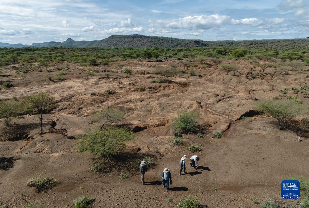11月4日,中肯聯(lián)合考古隊(duì)隊(duì)員在位于肯尼亞巴林戈郡馬里加特鎮(zhèn)的考古現(xiàn)場(chǎng)周邊區(qū)域進(jìn)行野外調(diào)查(無(wú)人機(jī)照片)。