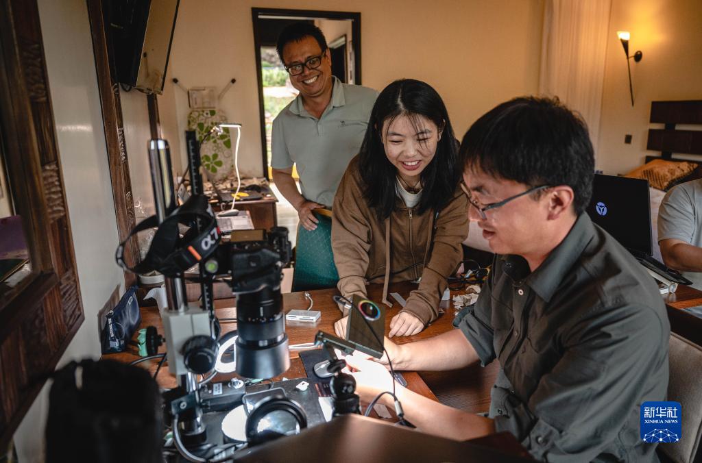 11月3日,中肯聯(lián)合考古隊中方現(xiàn)場負責人趙清坡(右)與隊員彭勝藍(中)、顧雪軍(左)在位于肯尼亞巴林戈郡馬里加特鎮(zhèn)的臨時駐地內(nèi)進行交流。