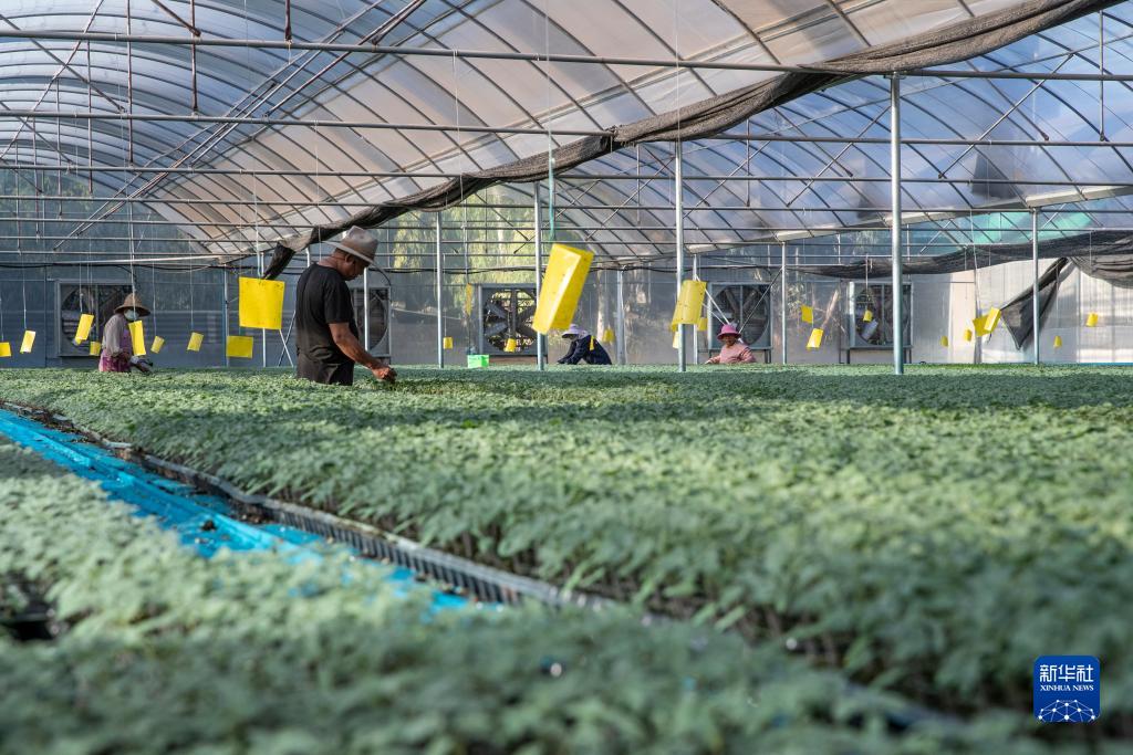 工人在云南元謀現(xiàn)代種業(yè)科技園育苗工廠大棚內(nèi)查看種苗生長(zhǎng)情況(11月5日攝)。