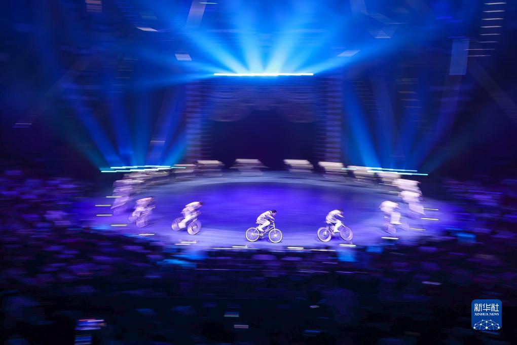中國雜技團演員表演創新節目“逐風者·男子集體車技”,綜合運用翻騰、頂功、拋接等技藝(11月5日攝)。
