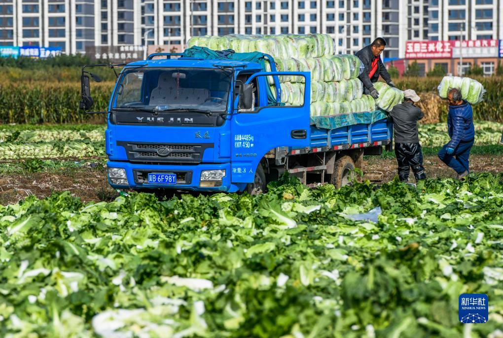 11月6日,河北省玉田縣虹橋鎮(zhèn)農(nóng)民在裝車外運白菜。