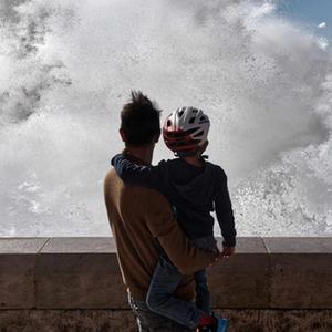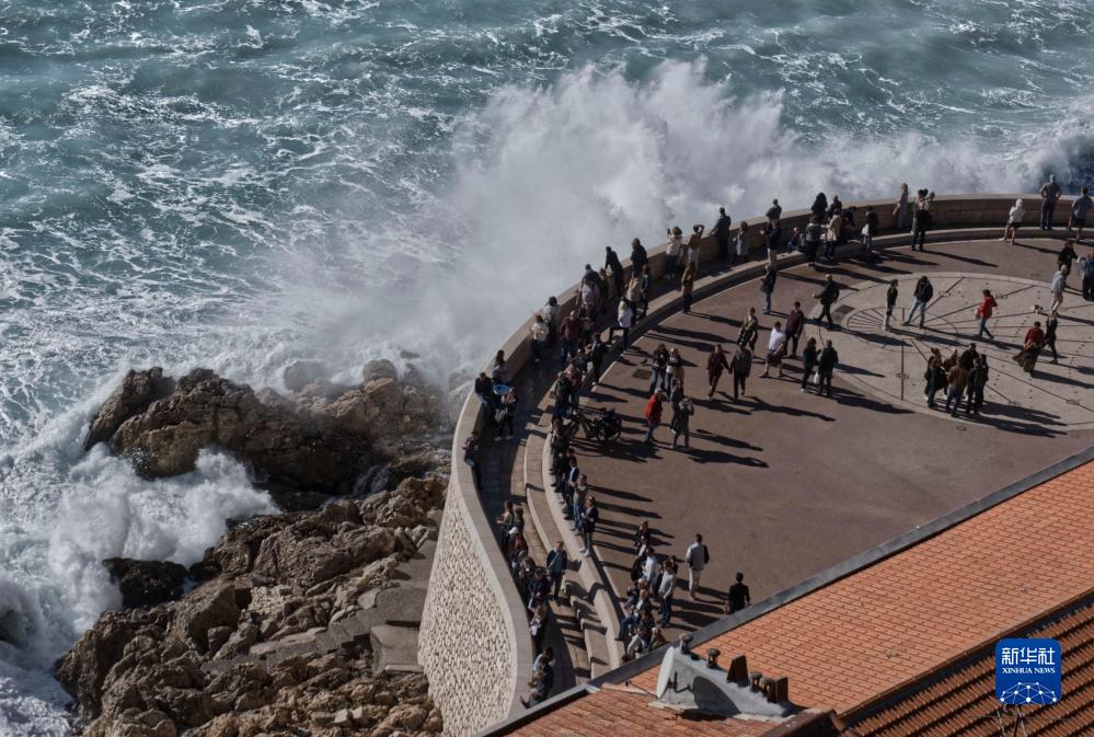 近日,受風暴天氣影響,法國尼斯海岸巨浪拍岸,吸引人們駐足觀看。