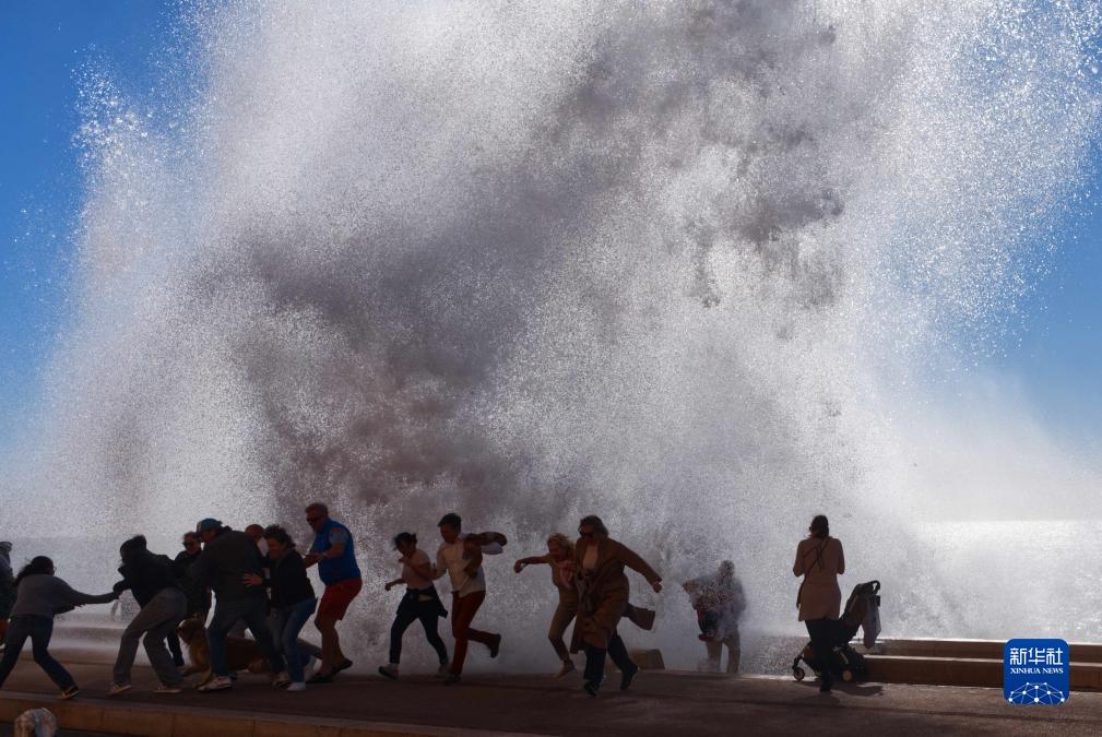 近日,受風暴天氣影響,法國尼斯海岸巨浪拍岸,吸引人們駐足觀看。