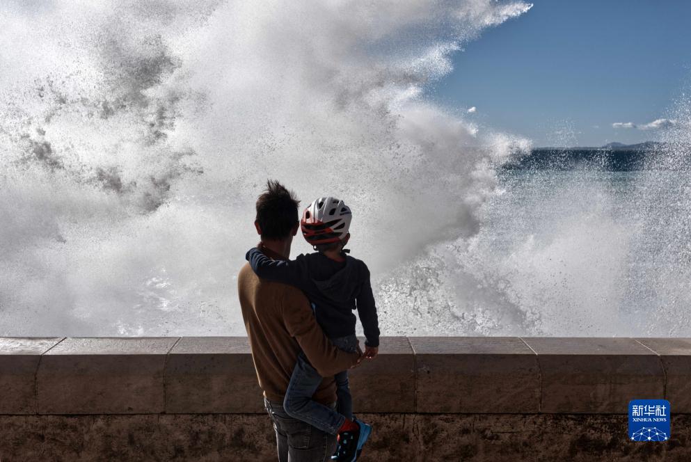 近日,受風暴天氣影響,法國尼斯海岸巨浪拍岸,吸引人們駐足觀看。