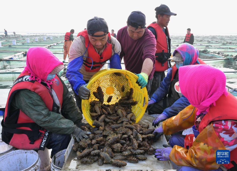 11月6日,河北省唐山市曹妃甸區一家深海網箱海參養殖合作社的社員在分揀剛捕撈的海參。