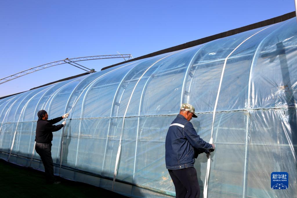 11月6日,山東省濱州市濱城區楊柳雪鎮農民在加固蔬菜大棚。