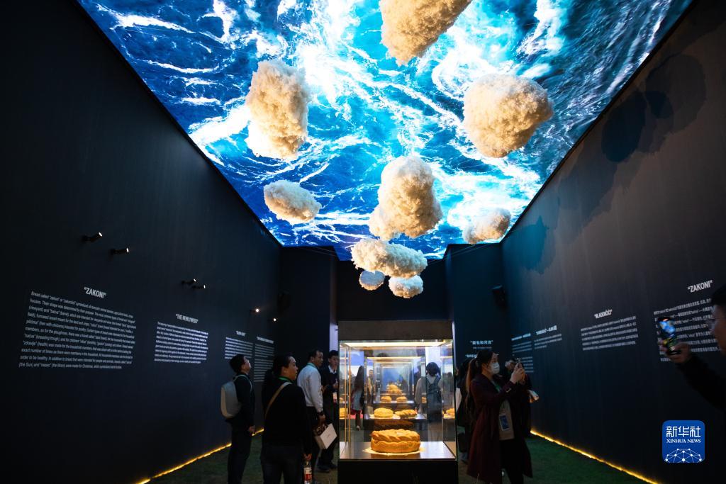 11月6日,參觀者在第六屆進(jìn)博會(huì)國(guó)家展塞爾維亞展臺(tái)欣賞塞爾維亞面包。