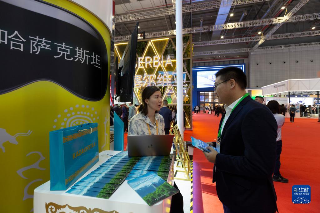 11月6日,在第六屆進(jìn)博會國家展哈薩克斯坦展臺,哈薩克斯坦國家旅游公司工作人員和觀眾交流。