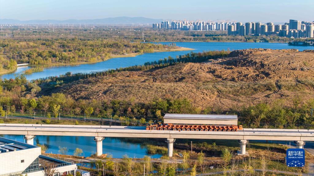 施工車輛在中鐵四局合新鐵路安徽段運(yùn)送箱梁(11月6日攝,無(wú)人機(jī)照片)。