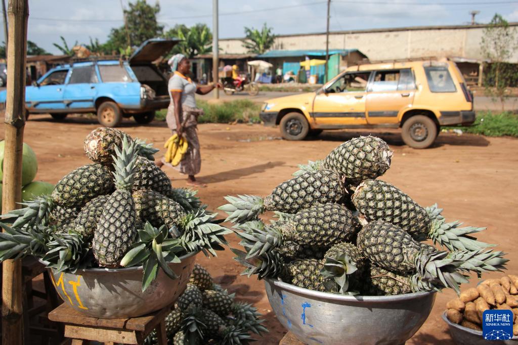 這是10月23日在貝寧“甜面包”菠蘿主產(chǎn)區(qū)澤鎮(zhèn)拍攝的水果攤上的菠蘿。