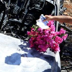 11月6日,在黎巴嫩南部艾納塔,人們站在被以色列無人機炸毀的車輛殘骸旁。