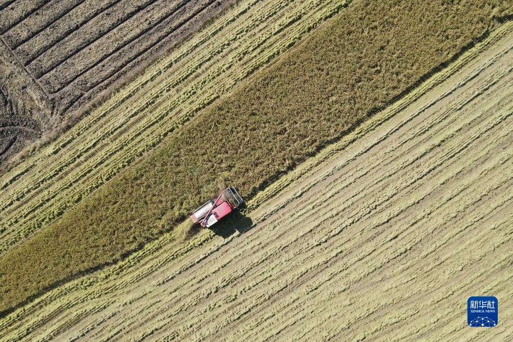11月7日,在安徽省蕪湖市繁昌區荻港鎮,村民駕駛收割機收割水稻(無人機照片)。