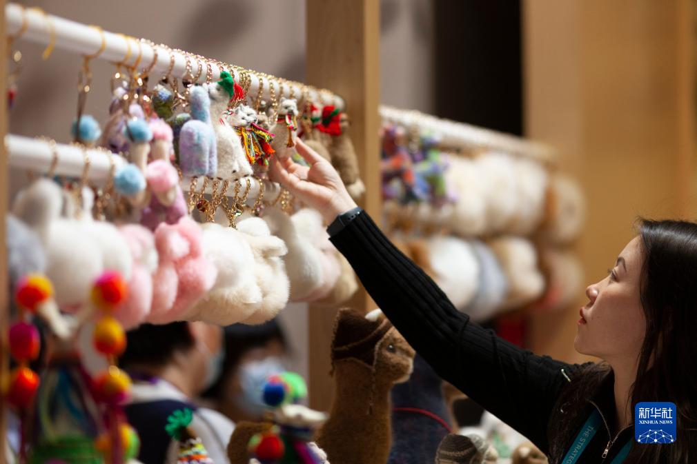 11月7日,參觀者在上海進博會“溫暖駝”品牌展臺挑選羊駝玩偶。