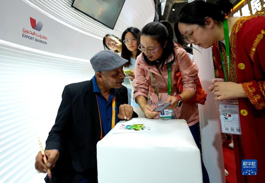 11月7日,在第六屆進博會國家展區,巴林王國展臺一位藝術家與觀眾互動交流。