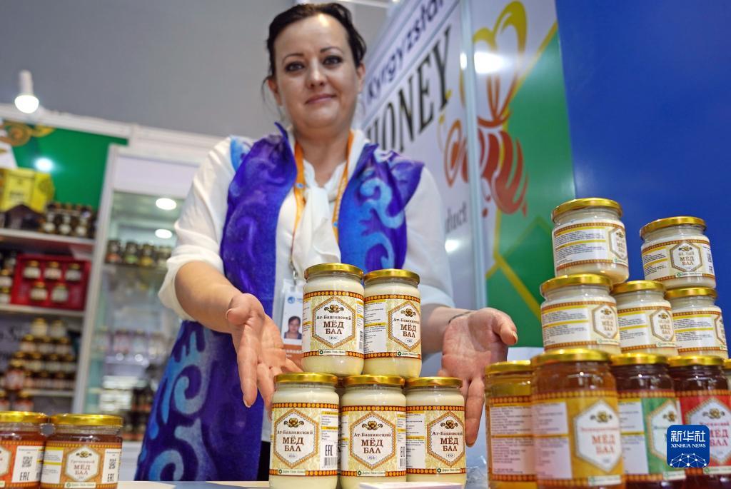 11月7日,在第六屆進博會食品及農產品展區,展商展示來自吉爾吉斯斯坦的蜂蜜。