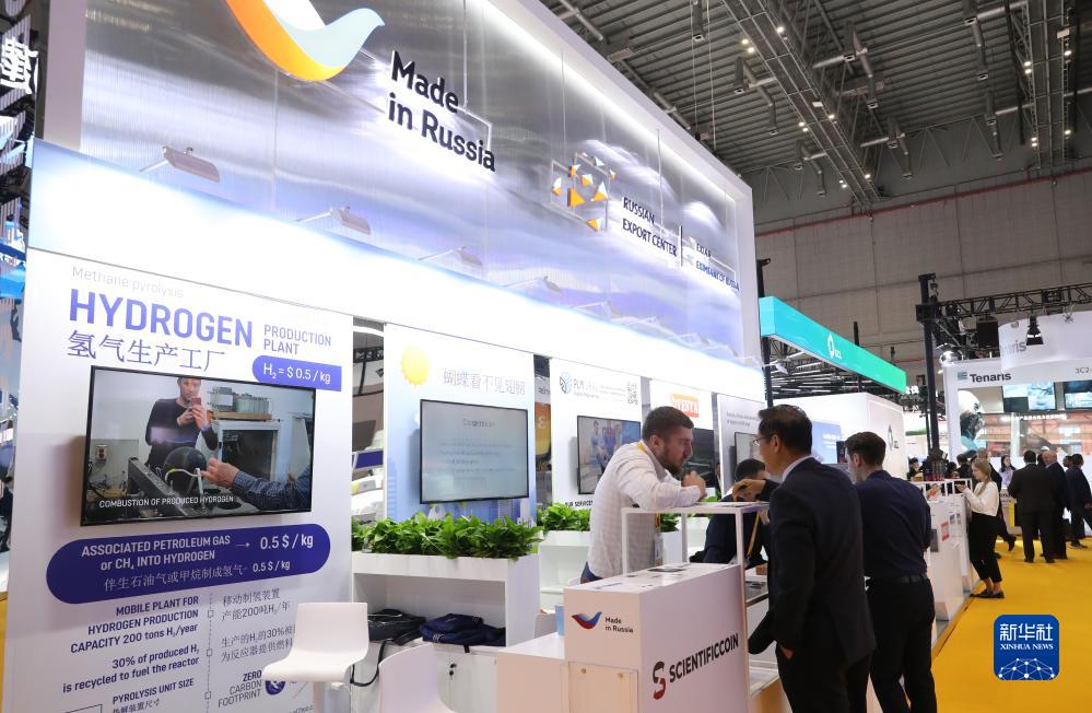 11月7日,參觀者在第六屆進博會技術裝備展區的俄羅斯企業聯合展臺與展方工作人員交流。