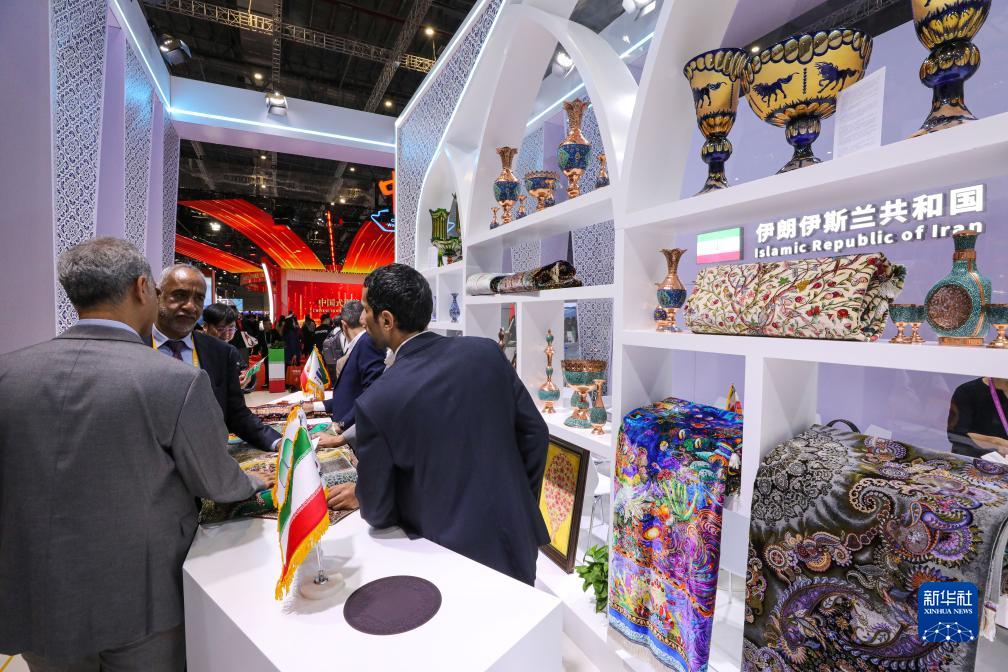 11月6日,參觀者在第六屆進博會國家展伊朗展臺與展商交談。