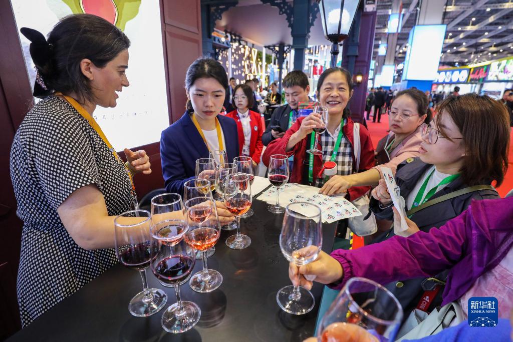 11月6日,參觀者在第六屆進博會國家展格魯吉亞展臺品嘗格魯吉亞紅酒。