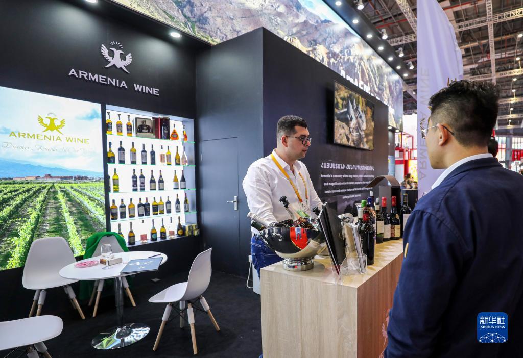 11月7日,參觀者在第六屆進博會國家展亞美尼亞展臺咨詢亞美尼亞紅酒。