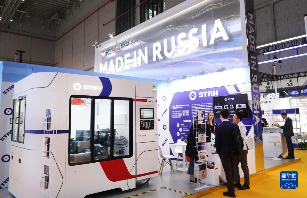 11月7日,參觀者在第六屆進博會技術裝備展區的俄羅斯企業聯合展臺與展方工作人員交流。