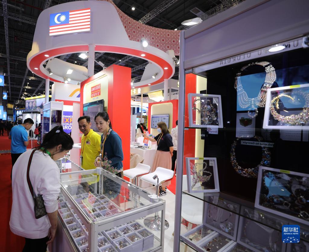 11月6日,參觀者在第六屆進博會國家展馬來西亞展臺欣賞展出的珠寶首飾。