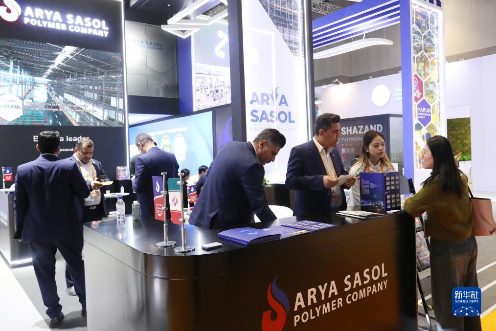 11月7日,參觀者在第六屆進(jìn)博會(huì)技術(shù)裝備展區(qū)的伊朗石油化學(xué)和工業(yè)公司展臺(tái)與展方工作人員交流。