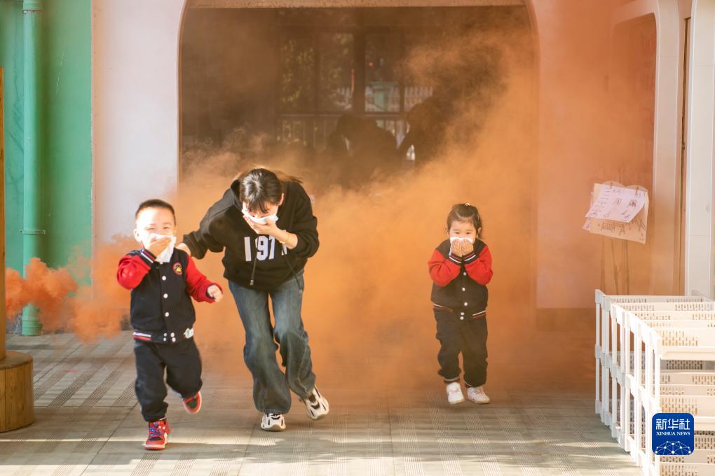 11月7日,在浙江省余姚市黃家埠鎮中心幼兒園,小朋友和老師參加火災逃生演練。