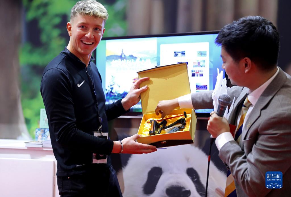 11月6日,在英國(guó)倫敦世界旅游交易會(huì)中國(guó)展區(qū),一名男子獲得文創(chuàng)禮物。