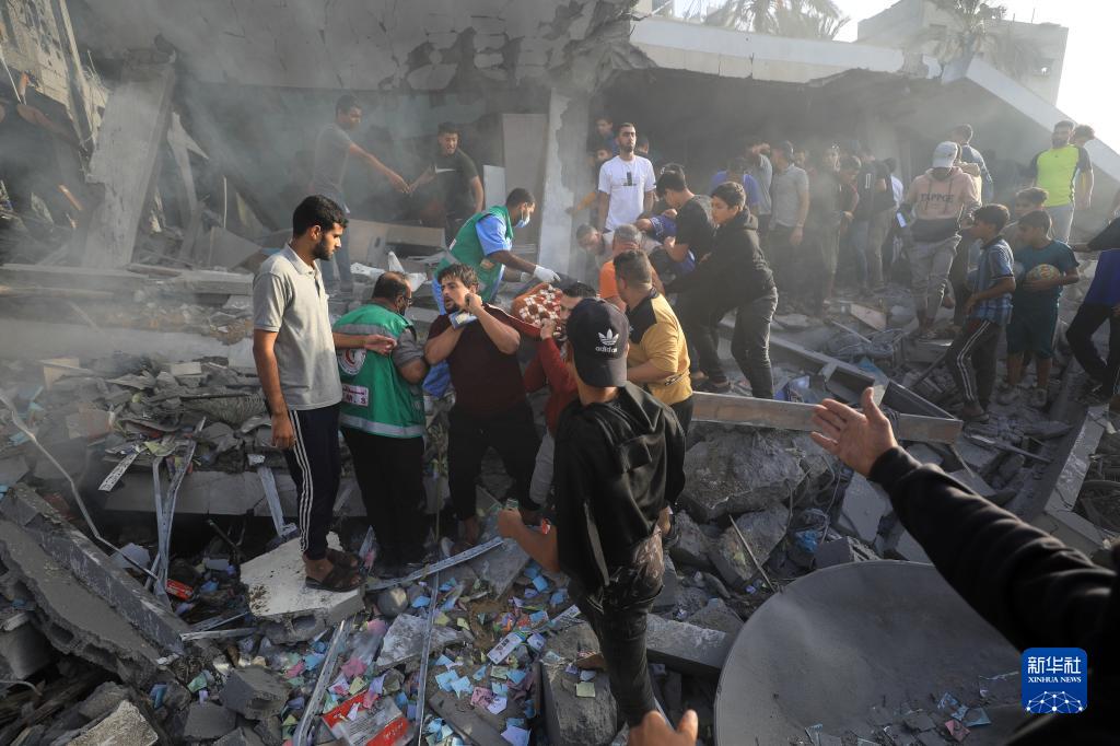 11月7日,在加沙地帶南部城市汗尤尼斯,人們在遭到以色列襲擊的建筑廢墟上實施救援。