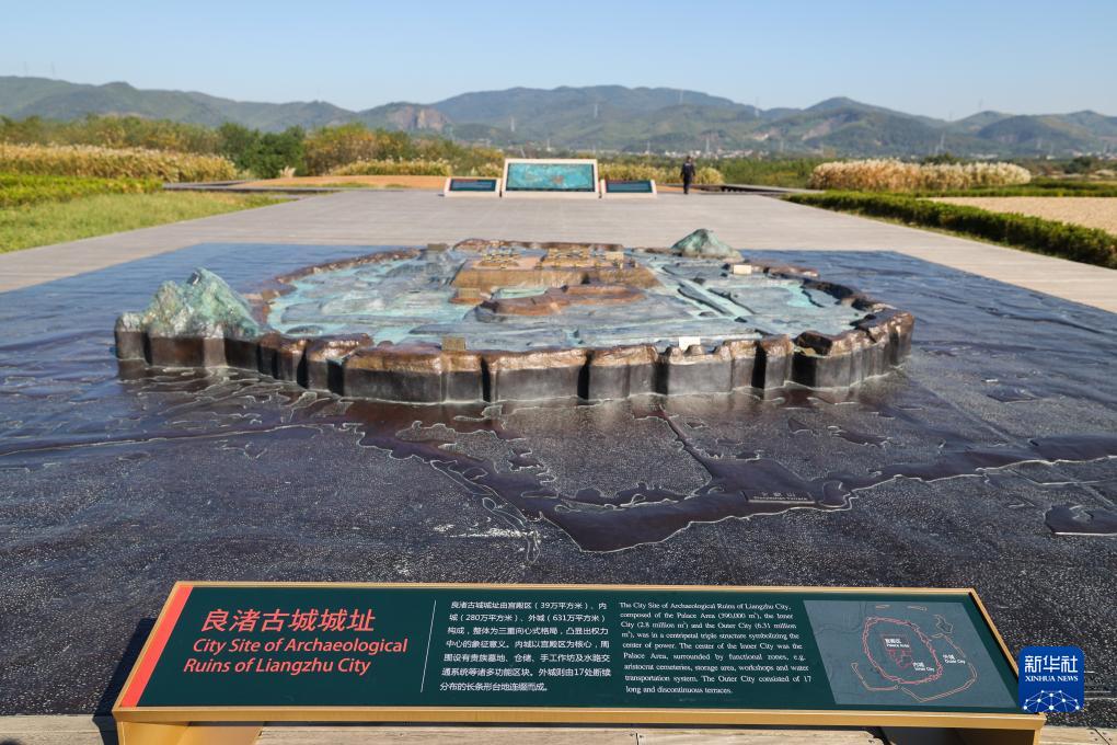11月7日拍攝的良渚古城遺址公園內(nèi)莫角山遺址上的良渚古城城址模型。