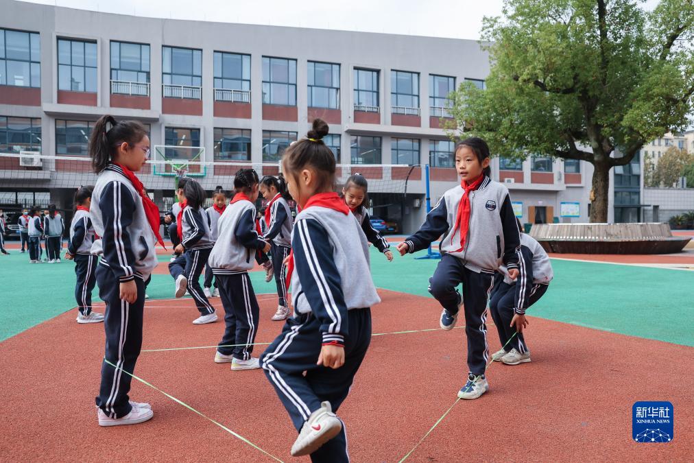 11月8日,湖州市月河小學教育集團吉山校區的學生們在課間跳皮筋。