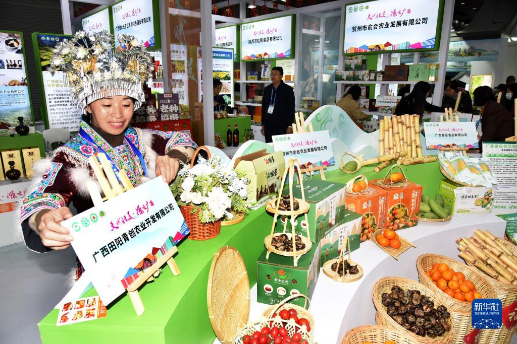 11月9日,一名來自廣西的參會者在布置展臺。