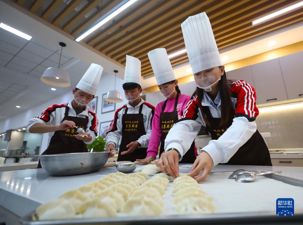 11月9日,在沈陽農(nóng)業(yè)大學一食堂,學生在共享廚房學習包餃子。