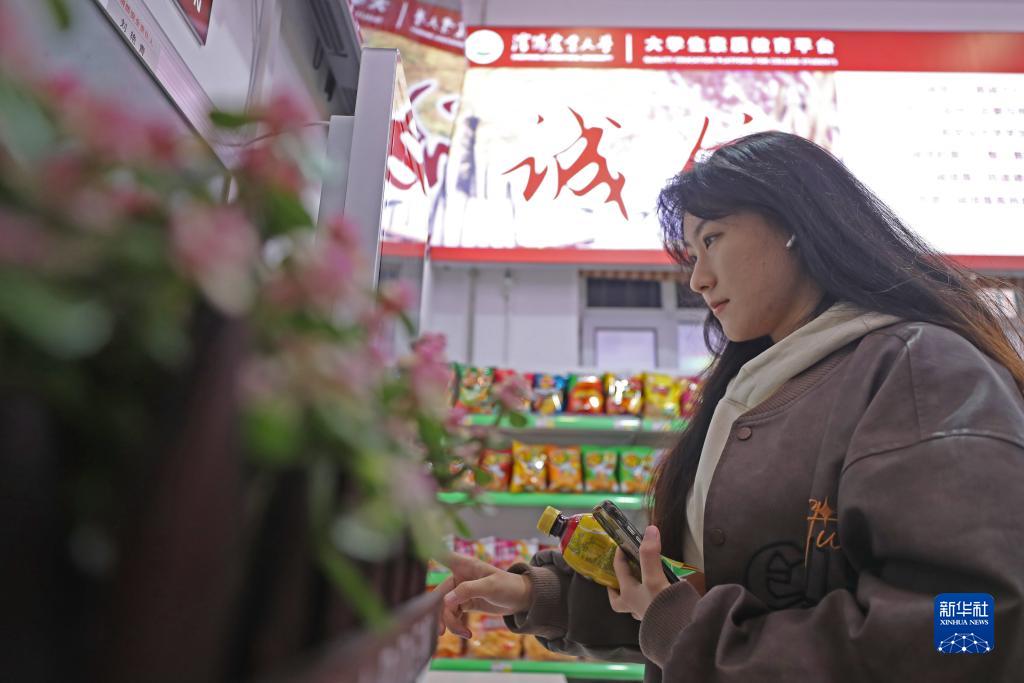 10月19日,在沈陽農業大學五食堂,學生在無人值守的誠信超市內購物掃碼結算。