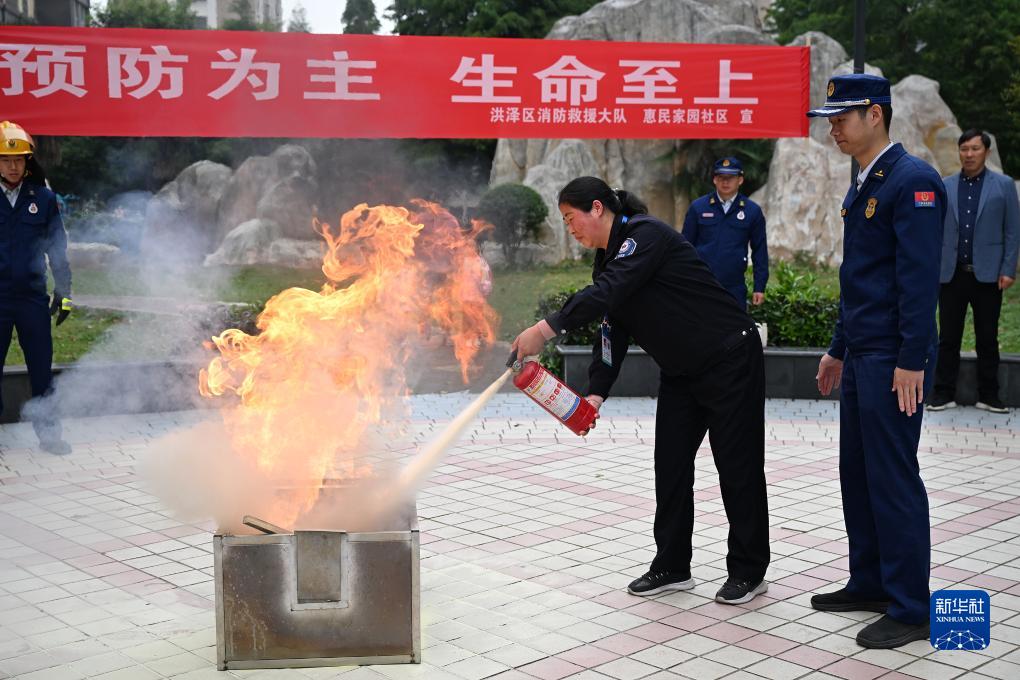 11月9日,在江蘇省淮安市洪澤區(qū)高良澗街道潤園小區(qū),網(wǎng)格員在體驗滅火。