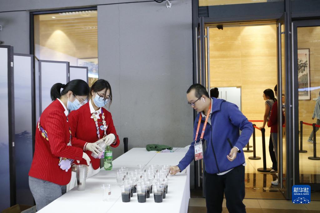 11月7日,上海杉達學院志愿者在新聞中心餐廳提供餐飲服務。