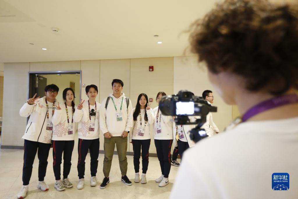 11月7日,在第六屆進博會上,上海理工大學的“小葉子體驗官”在拍攝進博會志愿者宣傳視頻。