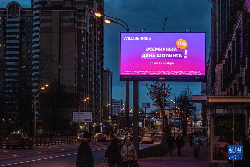 11月8日,在俄羅斯首都莫斯科,行人在播放電商平臺(tái)“雙十一”促銷(xiāo)廣告的顯示屏前走過(guò)。