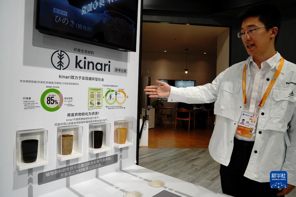 11月9日,在消費品展區松下展臺,工作人員介紹利用植物廢棄物轉化的纖維生態材料。