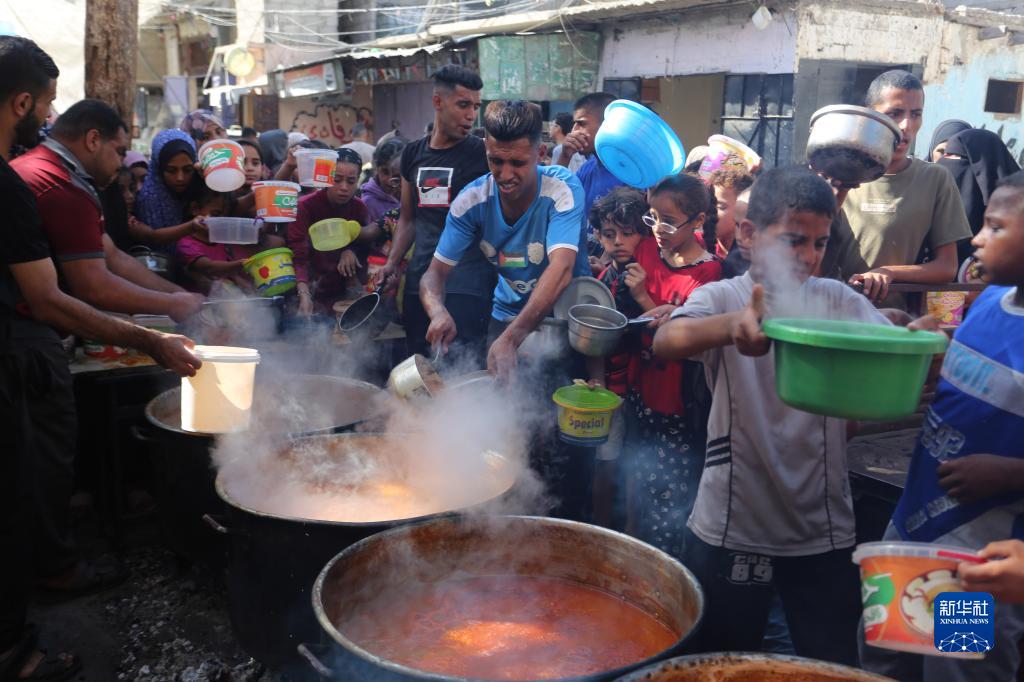 11月9日,在加沙地帶南部城市拉法,人們?cè)谝粋€(gè)臨時(shí)分發(fā)點(diǎn)排隊(duì)領(lǐng)取食物。