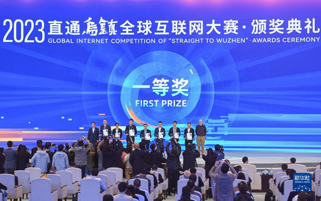 11月10日,獲得2023“直通烏鎮(zhèn)”全球互聯(lián)網(wǎng)大賽一等獎的代表在頒獎典禮上。