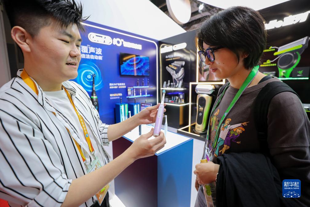 11月8日,寶潔公司工作人員在第六屆進(jìn)博會(huì)消費(fèi)品展區(qū)向觀眾介紹歐樂(lè)B電動(dòng)牙刷。
